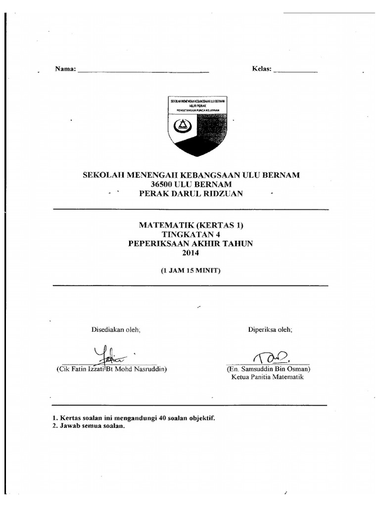 Peperiksaan Akhir Tahun Matematik Tingkatan 4 Pdf